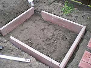 Eine Buddelkiste darf natürlich auch nicht fehlen. Hierfür wird zunächst ein rechteckiges Loch ausgehoben, dieses wird mit Volierendraht gesichert und mit Steinen stabilisiert. Das ganze wird mit Erde aufgefüllt und zum krönenden Abschluss mit Grassoden verziert. Die Lebensdauer des Rasens dürfte allerdings nicht besonders lange sein.