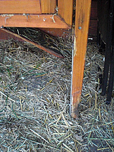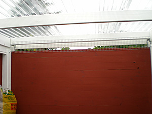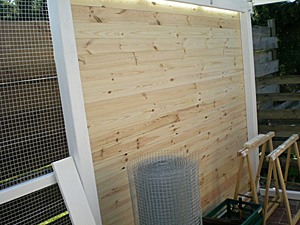 Die Wände werden zum Teil mit Volierendraht zum Teil mit Brettern gesichert. Die Sicherung mit Volierendraht ist schneller und billiger. Die Bretterwand bietet aber zusätzlich Schutz vor Wind und Sonne.