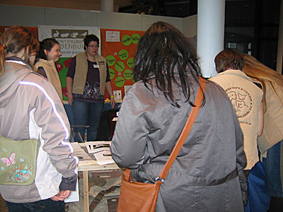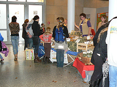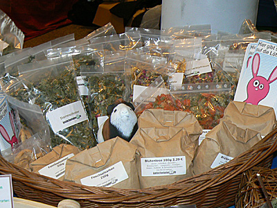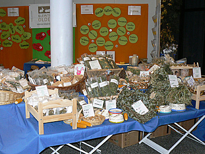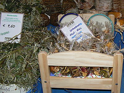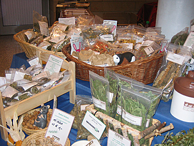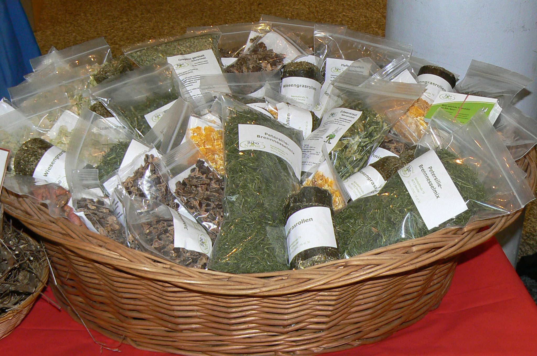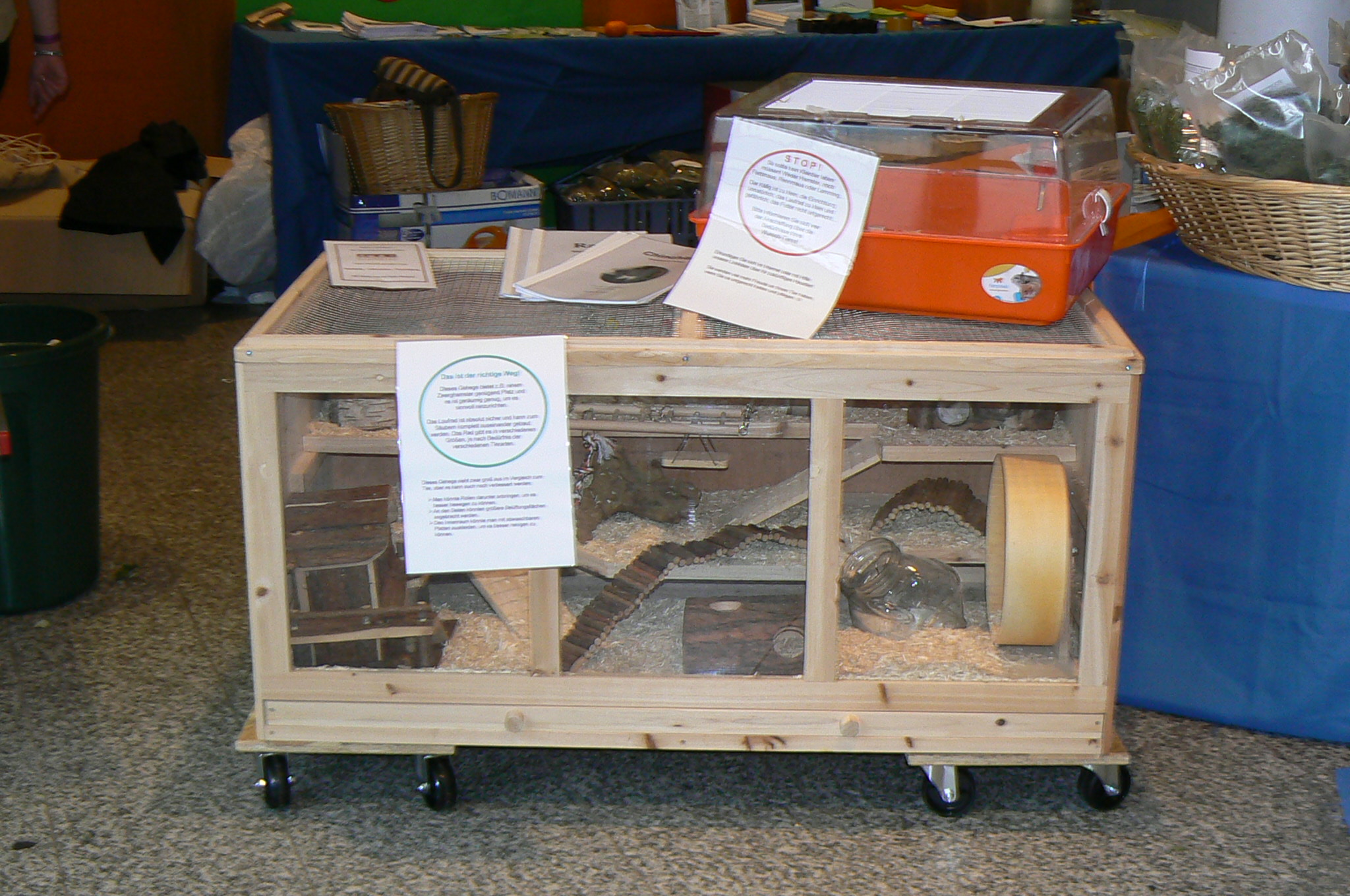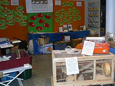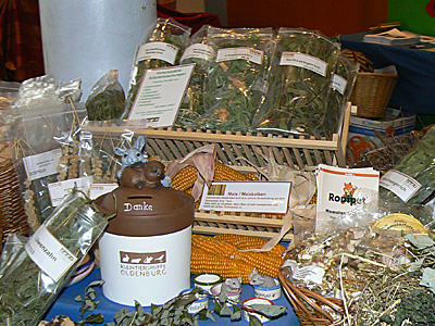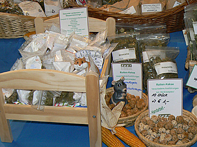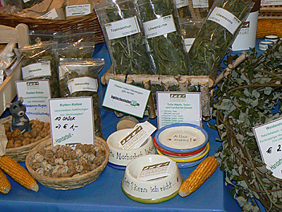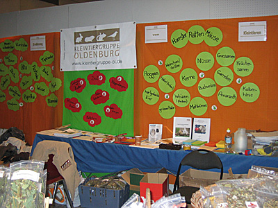 Hier die Bilder von unserem Stand auf der Mein Tier am 14. und 15. November 2009 ![]() ![]() einmal der Stand im Überblick... Wir hatten relativ viel Platz in einer Ecke der Kleinnager-Halle ![]() ![]() Ein ganzer Stand voll mit Leckereien für Kaninchen und Co. Für die Halter gab's jede Menge Informationen über Ernährung der jeweiligen Tiere. ![]() Die passende Essgeschirr wurde uns von Pimpi und ihrer Keramikkiste zur Verfügung gestellt. Auch die süßen Tierchen in den jeweiligen Körbchen haben viel Aufsehen erregt. ![]() Die Leckereien vom Kleintierbistro waren fast restlos ausverkauft... ![]() genau wie die Spezialitäten aus dem Kaninchenladen... Das kecke Schweinchen war ein besonderer Blickfang für Claudia's Futterkörbchen :-) ![]() Es gab natürlich auch was Leckeres für die Kleinen unter uns... Steppenlemming hat uns einiges aus ihrem Sortiment zur Verfügung gestellt und die selbstgemachten Rattenkekse von Marina waren der Renner. ![]() ![]() Das waren die gesunden Leckereien, die die Kleintier-Mädels den ganzen Sommer über gesammelt, getrocknet und gebastelt haben. Besonderes Leckerlie war das selbstgetrocknete Obst... und die riesen Weidenbälle zum Auseinandernehmen und komplett auffuttern. ![]() Hier das Körbchen mit den Bibo-Natur Leckereien... ![]() ![]() ![]() ... und wie man sieht, wurde das Angebot interessiert begutachtet, wir konnten viele Infos weitergeben und eine Menge Aufklärungsarbeit leisten und viele Tiere wurden Zuhause mit unseren Leckereien verwöhnt! Es war für uns ein voller Erfolg!! ![]() Es gab viel Erstaunen über unsere Gegenüberstellung eines positiven und eines negativen Beispiels für ein Hamsterzuhause... Vielleicht bekommt ja nun der ein oder andere kleine Zwerg ein größeres Zuhause! und zum Abschluss: ![]() Jasmin macht Quatsch :))))) |